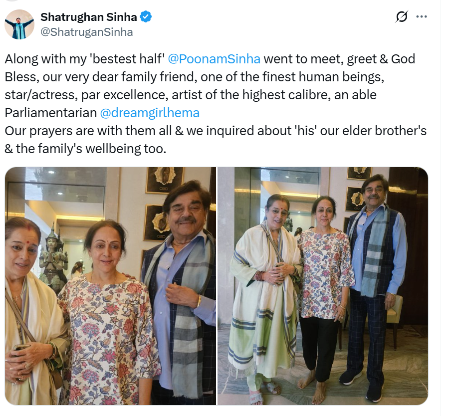 इस मुलाकात की फोटो शत्रुघ्न सिन्हा ने अपने सोशल मीडिया अकाउंट एक्स पर शेयर की और लिखा- ‘अपनी बेस्ट हाफ पूनम के साथ…हमारी डियर फैमिली फ्रेंड और बेहतरीन इंसानों में से एक, एक शानदार स्टार, बेहतरीन आर्टिस्ट, योग्य सांसद हेमा मालिनी से मिलने, उनका हालचाल जानने और शुभकामनाएं देने गया।