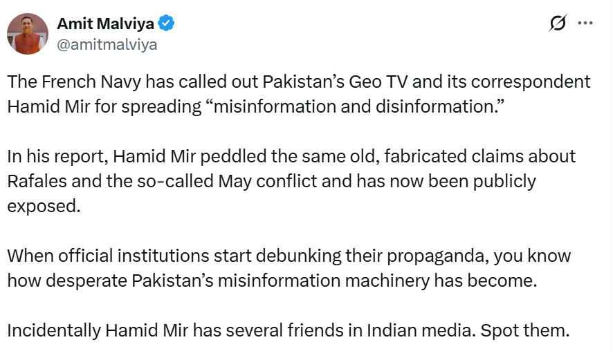 बीजेपी नेता अमित मालवीय ने कहा कि पाकिस्तान का मिस इन्फॉर्मेशन नेटवर्क एक बार फिर बेनकाब हो गया है। उन्होंने कहा कि हामिद मीर की रिपोर्ट में राफेल जेट्स को लेकर वही पुराने, मनगढ़ंत दावे दोहराए गए, जिन्हें अब फ्रांसीसी नेवी ने भी झूठा बता दिया है।