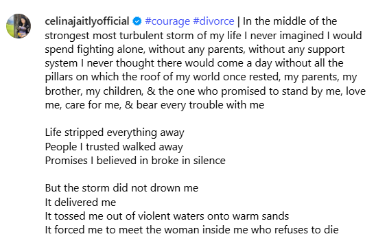 सेलिना जेटली ने अपने तलाक पर खुलकर लिखा, ‘हौसला, तलाक। अपने जीवन के सबसे कठिन, सबसे उथल-पुथल भरे तूफान के बीच, मैंने कभी नहीं सोचा था कि मुझे यह लड़ाई अकेले लड़नी पड़ेगी। बिना किसी माता-पिता के, बिना किसी सपोर्ट सिस्टम के। मैंने कभी नहीं सोचा था कि एक दिन ऐसा भी आएगा जब मेरी दुनिया की छत को थामने वाले सभी स्तंभ, मेरे माता-पिता, मेरा भाई, मेरे बच्चे, और वह व्यक्ति जिसने मुझसे वादा किया था कि वह मेरे साथ खड़ा रहेगा, मुझसे प्यार करेगा, मेरी देखभाल करेगा, और हर मुश्किल में मेरे साथ रहेगा, सब गायब हो जाएंगे।’