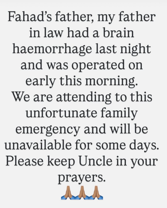 स्वरा ने इंस्टाग्राम पर एक नोट शेयर कर लिखा, “फहाद के पिता और मेरे ससुर को कल रात ब्रेन हेमरेज हुआ और आज सुबह ऑपरेशन हुआ। हम इस समय परिवार की इस स्थिति में बिजी हैं और कुछ दिनों तक उपलब्ध नहीं रहेंगे। कृपया अंकल के लिए दुआ करें।”