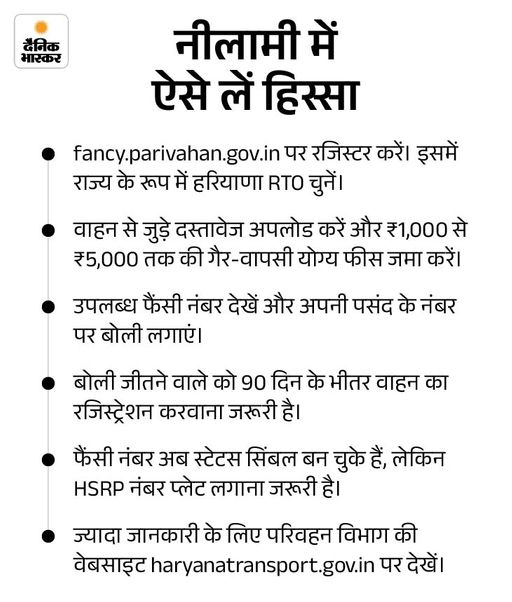 हरियाणा में वीआईपी नंबरों की नीलामी प्रक्रिया हरियाणा में हर सप्ताह ऑनलाइन माध्यम से वीआईपी या फैंसी नंबरों की नीलामी होती है। शुक्रवार शाम 5 बजे से सोमवार सुबह 9 बजे तक इच्छुक लोग अपने पसंदीदा नंबर के लिए आवेदन करते हैं। बुधवार शाम 5 बजे अंतिम परिणाम घोषित किए जाते हैं। यह पूरी प्रक्रिया सरकारी पोर्टल पर ऑनलाइन होती है।