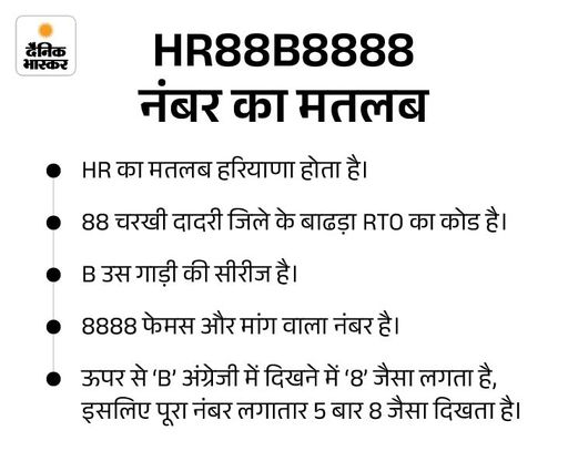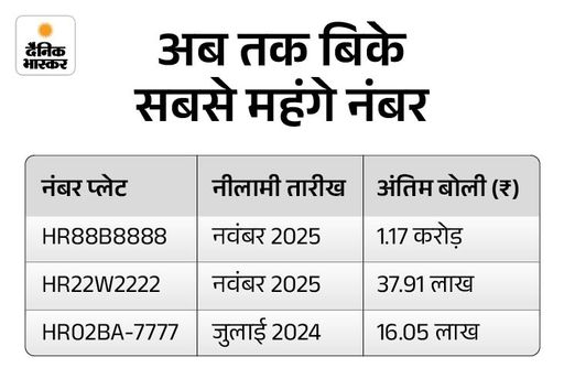 पिछले सप्ताह सबसे अधिक आवेदन जिस नंबर को मिले, वह HR88B8888 था। इसके लिए 45 लोगों ने बोली लगाई। आधार बोली 50,000 रुपए रखी गई थी, जो मिनट दर मिनट बढ़ते हुए 1.17 करोड़ रुपए पर जाकर थमी।