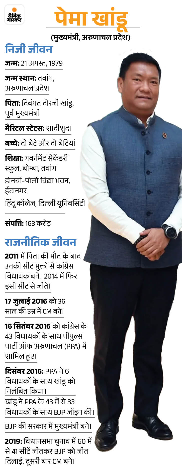 खांडू इकलौते नेता हैं, जिन्होंने 2016 में सीएम रहते छह महीने में तीन पार्टियां बदलीं। जुलाई में कांग्रेस से सीएम बने, सितंबर में पीपुल्स पार्टी ऑफ अरुणाचल (पीपीए) में आए और दिसंबर में सस्पेंड होने पर पीपीए के 43 में से 33 विधायकों के साथ भाजपा में शामिल होकर सीएम पद पर बने रहे।