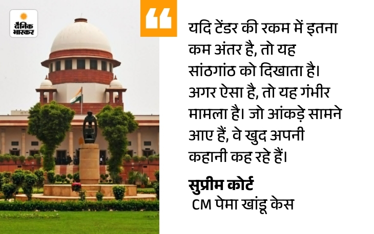 अरुणाचल प्रदेश में भाजपा सरकार के मुख्यमंत्री पेमा खांडू के परिवार की कंपनियों को बड़ी संख्या में ठेके देने पर सुप्रीम कोर्ट ने मंगलवार को सख्ती दिखाई। कोर्ट ने कहा कि सरकार के जवाब से स्पष्ट है कि सीएम के परिवार को बड़ी संख्या में काम दिया गया। यह संयोग अद्भुत है।