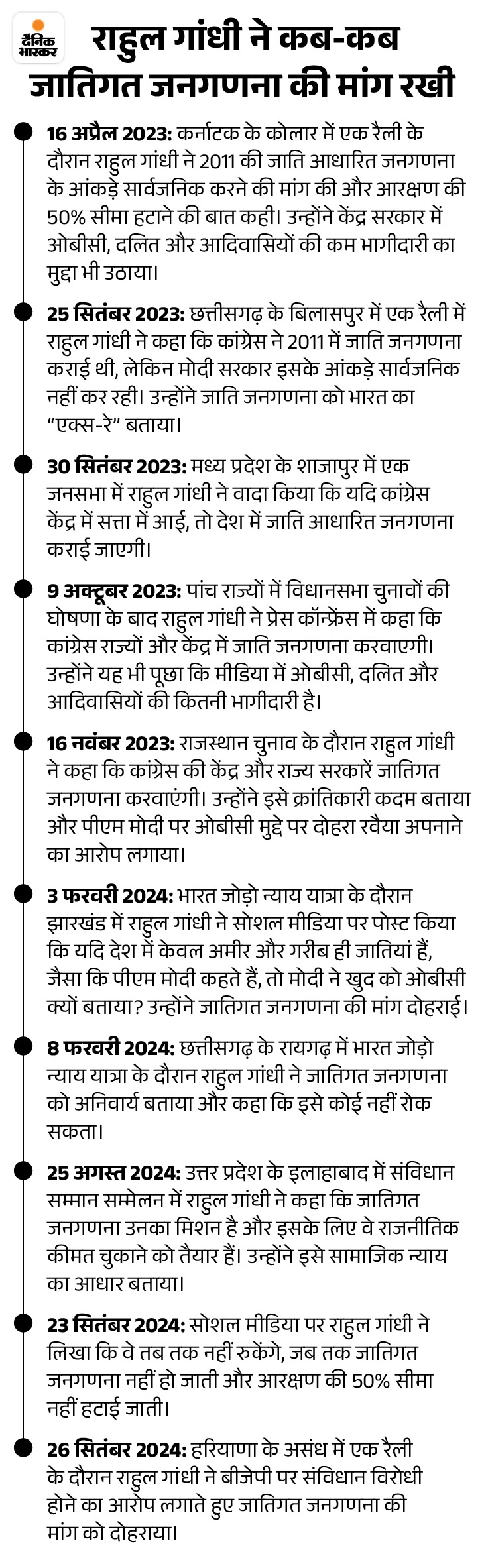नेता प्रतिपक्ष राहुल गांधी ने 2023 में सबसे पहले जाति जनगणना की मांग की थी। इसके बाद वे देश-विदेश की कई सभाओं और फोरम पर केंद्र से जाति जनगणना कराने की मांग करते रहे हैं। नीचे ग्राफिक में देखें राहुल ने कब और कहां जाति जनगणना की मांग दोहराई-