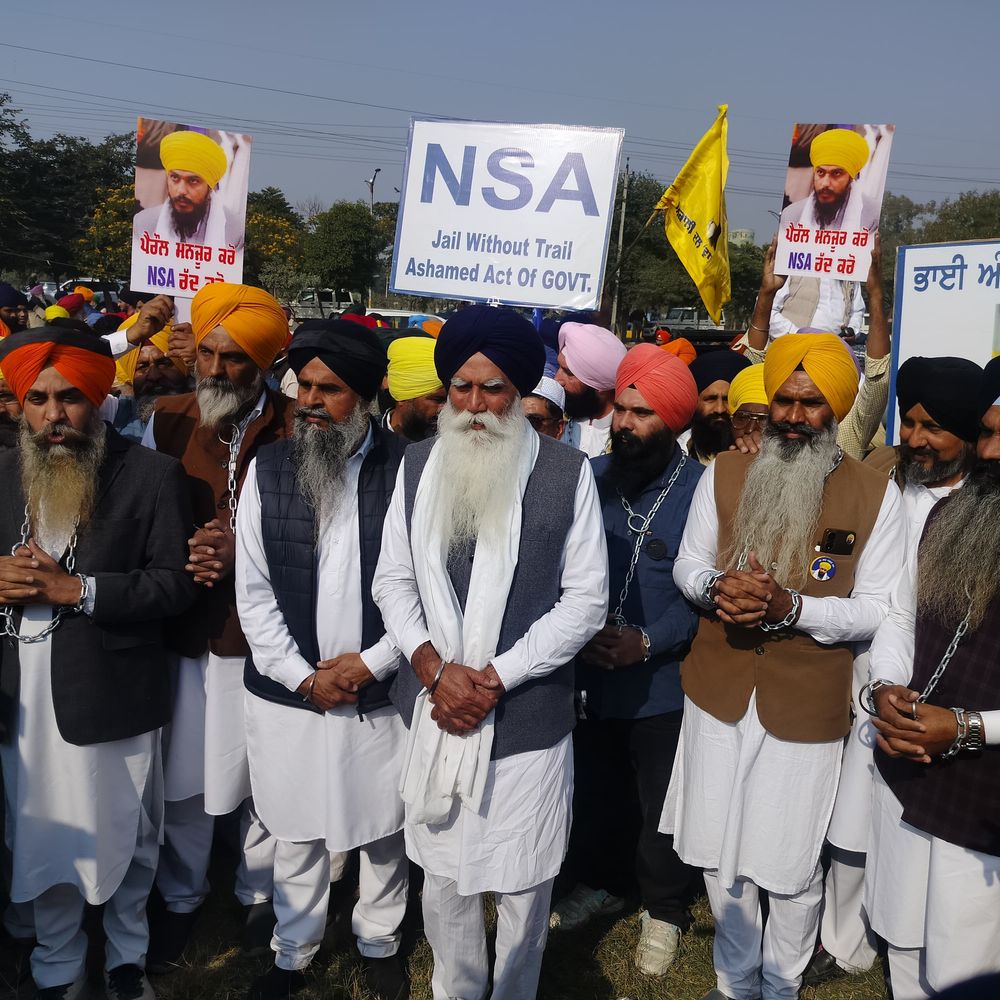 सांसद भाई अमृतपाल सिंह खालसा दो साल से अधिक समय से डिब्रूगढ़ जेल में बंद हैं। उन्हें न तो रिहा किया जा रहा है और न ही संसद में एक सांसद के तौर पर बोलने की अनुमति दी जा रही है। प्रदर्शनकारियों ने आरोप लगाया कि पहले उन पर राष्ट्रीय सुरक्षा कानून (NSA) लगाकर उन्हें पंजाब से बाहर भेजा गया।