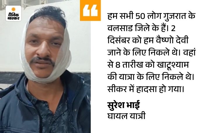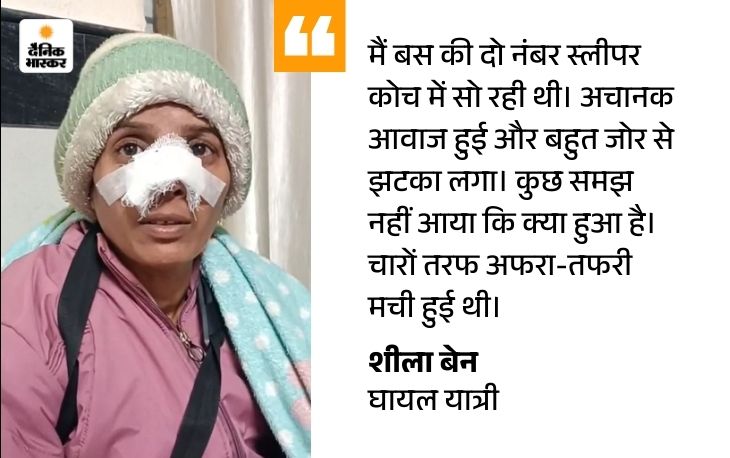 अचानक जोर का झटका लगा, लोग बस के गलियारे में गिर गए बस में सवार शीला बेन दो नंबर सीट पर थीं। उनकी नाक में फ्रैक्चर हुआ है। शीला बेन ने बताया- हम खाटूश्यामजी जा रहे थे। ज्यादातर सवारी सो चुकी थी। मैं अपने बेटे के साथ थी।