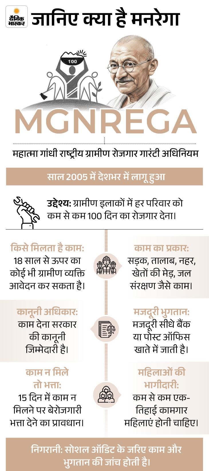 इसके तहत हर उस परिवार को एक फाइनेंशियल ईयर में कम से कम 100 दिनों की गारंटी वाली मजदूरी वाला काम दिया जाता है, जिसके बड़े सदस्य बिना हुनर का काम करने के लिए अपनी मर्जी से तैयार होते हैं। इसे 2005 में लागू किया गया था।
