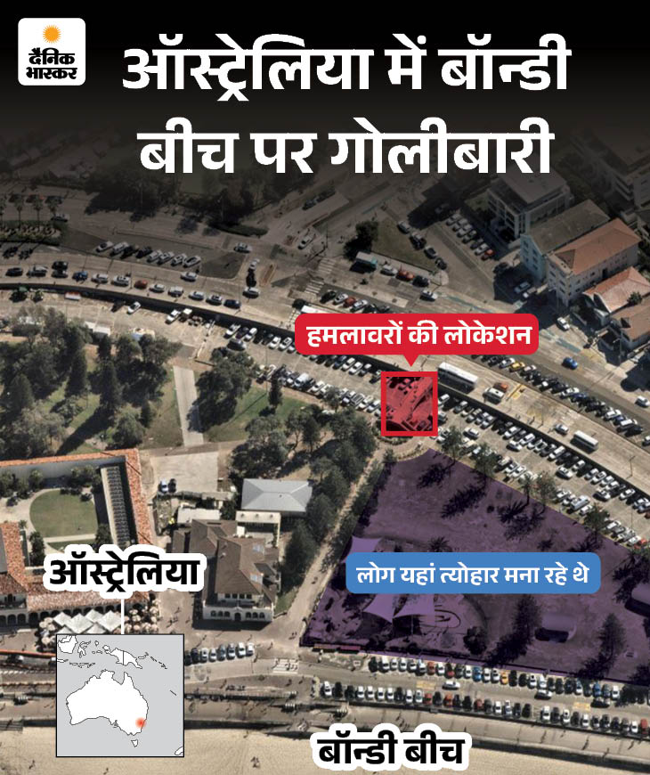 हमलावर 24 साल का, कुछ दिन पहले ही नौकरी छिनी थी घटना के वीडियो सोशल मीडिया पर वायरल हुए हैं। एक वीडियो में नॉर्थ बॉन्डी बीच पर कई लाशें बिखरीं नजर आ रही हैं। ऑस्ट्रेलिया के प्रधानमंत्री एंथनी अल्बनीज ने इस घटना को चौंकाने वाला और बहुत दुखद बताया है।