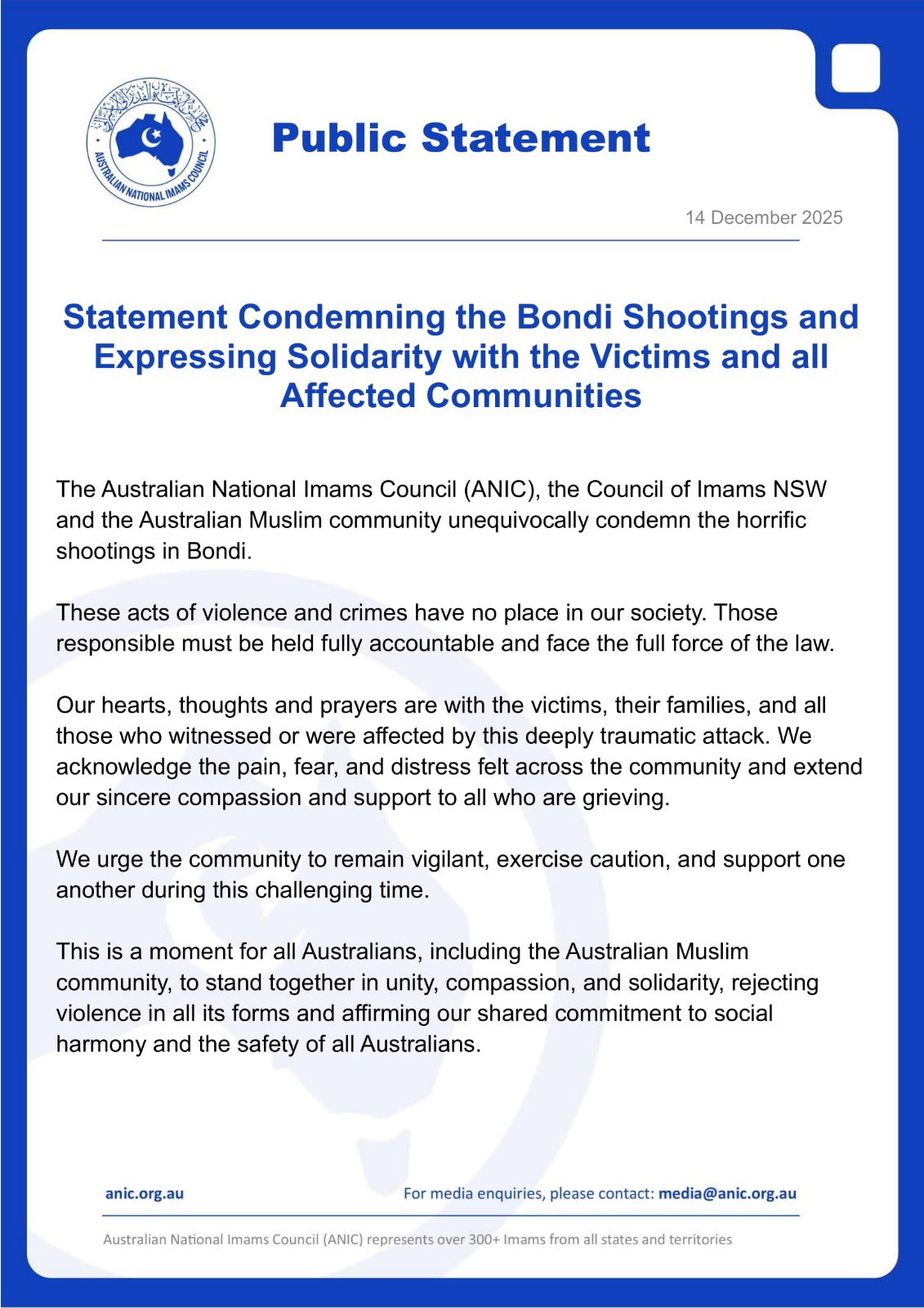 ऑस्ट्रेलियन नेशनल इमाम्स काउंसिल और काउंसिल ऑफ इमाम्स एनएसडब्ल्यू ने सोशल मीडिया प्लेटफॉर्म एक्स पर जारी संयुक्त बयान में कहा कि ऑस्ट्रेलियाई मुस्लिम समुदाय के साथ मिलकर वे बॉन्डी में हुई इस भयावह गोलीबारी की निंदा करते हैं।