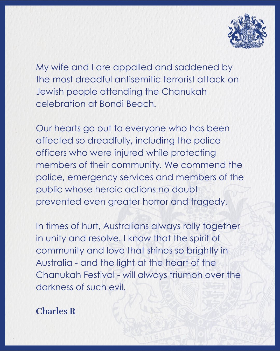 उन्होंने हनुक्का समारोह में यहूदी समुदाय पर हुए हमले को बेहद दर्दनाक बताया। किंग चार्ल्स ने हमले से प्रभावित लोगों के साथ-साथ ड्यूटी के दौरान घायल हुए पुलिस अधिकारियों के प्रति भी संवेदना व्यक्त की।