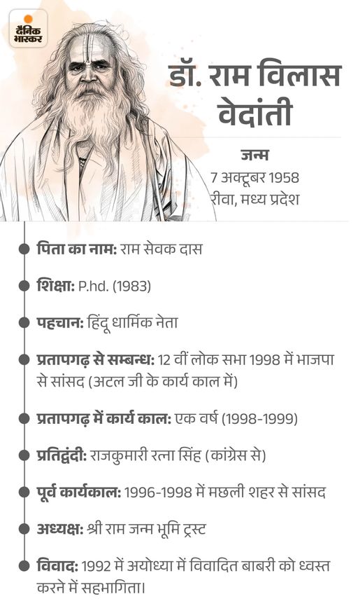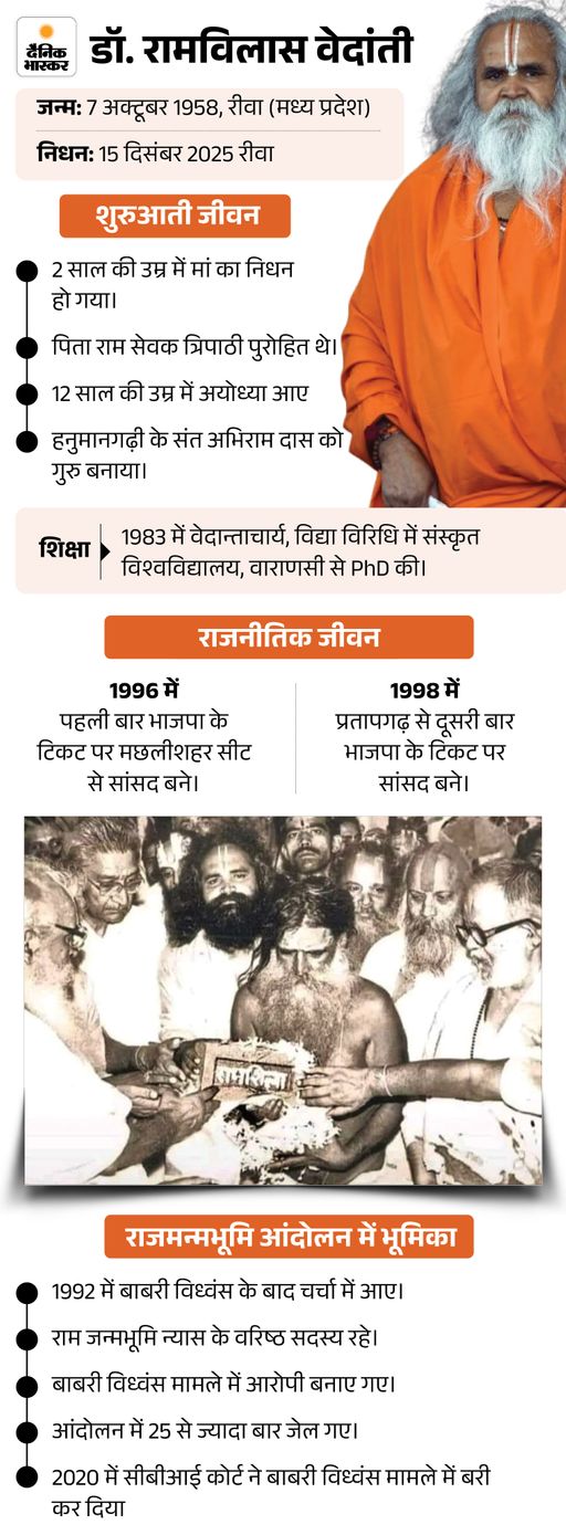 दरअसल, अयोध्या के प्रख्यात संत और पूर्व सांसद डॉ. रामविलास दास वेदांती महाराज का सोमवार को मध्यप्रदेश के रीवा में निधन हो गया। वे रीवा में रामकथा करने आए थे। इसी दौरान उनकी तबीयत बिगड़ी और उन्हें सुपर स्पेशियलिटी अस्पताल में भर्ती कराया गया। सोमवार दोपहर 12:40 बजे उन्होंने अंतिम सांस ली। डॉक्टरों के अनुसार वे सेप्टिसीमिया से पीड़ित थे। संक्रमण खून के जरिए किडनी और अन्य अंगों तक फैल गया था।