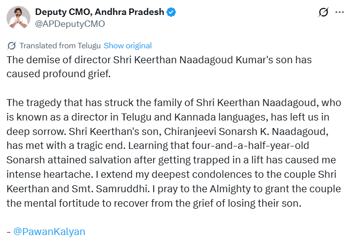 आंध्र प्रदेश के उपमुख्यमंत्री और एक्टर पवन कल्याण ने भी घटना पर दुख जताते हुए X पर लिखा कि वह लिफ्ट हादसे में सोनार्श की मौत से बहुत दुखी हैं। उन्होंने कीर्तन और उनकी पत्नी के प्रति संवेदना जताई और ईश्वर से परिवार को यह दुख सहने की ताकत देने की प्रार्थना की।