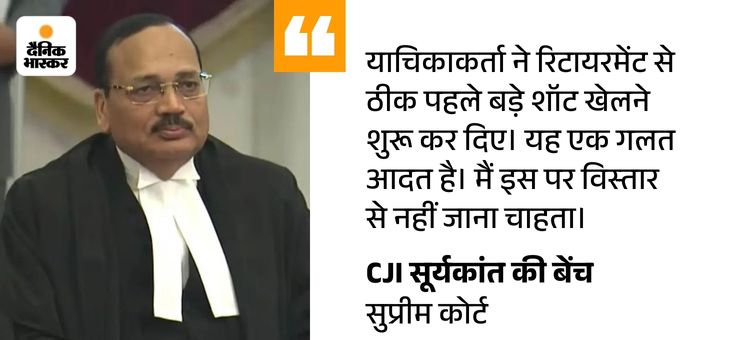 भारत के चीफ जस्टिस सूर्यकांत, जस्टिस जॉयमाल्या बागची और जस्टिस विपुल एम पंचोली की बेंच ने बुधवार को कहा- कुछ जजों में रिटायरमेंट से चंद दिनों पहले बहुत ज्यादा आदेश पारित करने की प्रवृत्ति बढ़ रही है। वे आदेश ऐसे सुनाते हैं, जैसे मैच के अंतिम ओवर में छक्के मार रहे हों।