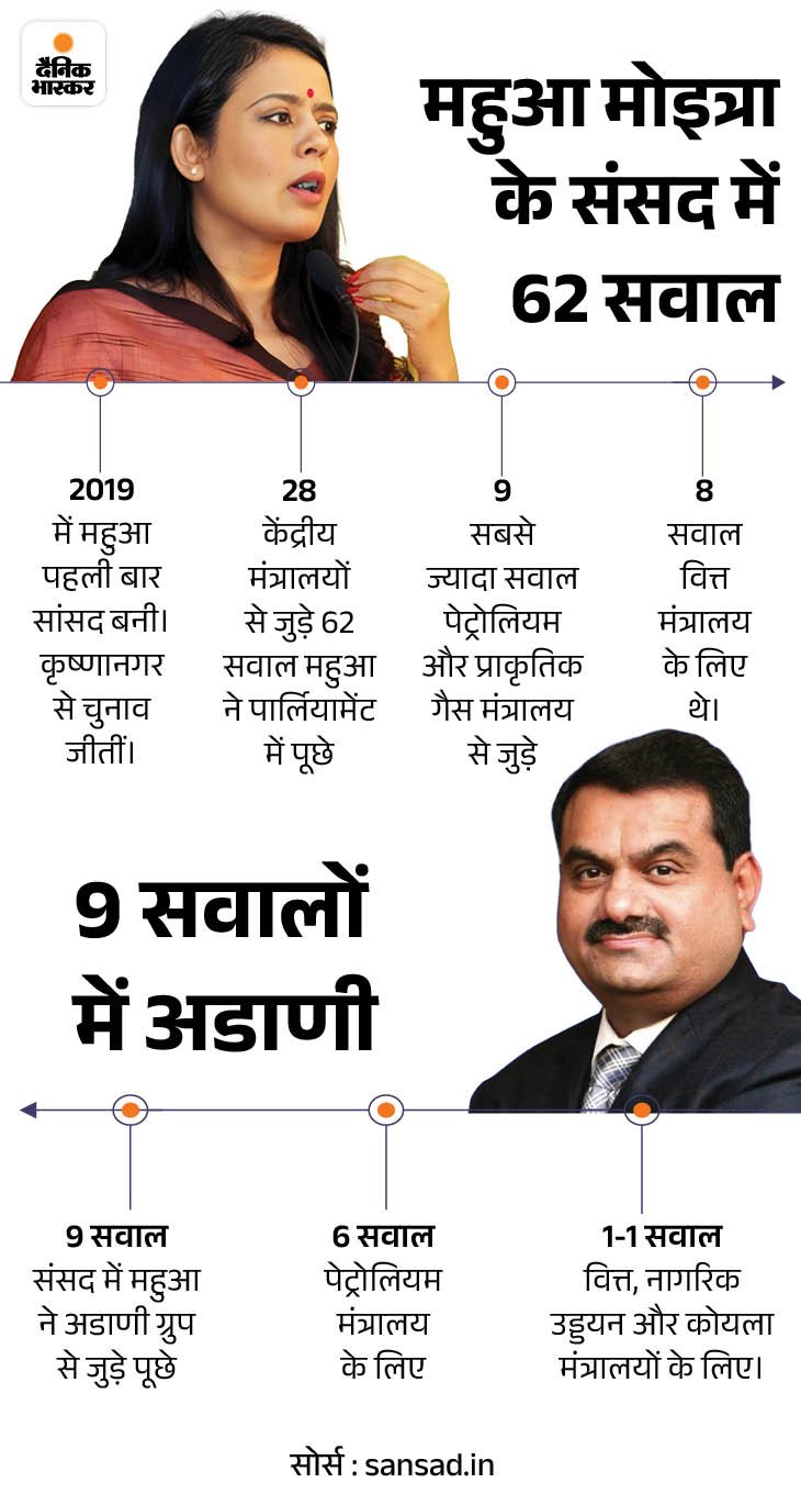 2019 में सांसद बनने के बाद से महुआ मोइत्रा ने पार्लियामेंट में 28 केंद्रीय मंत्रालयों से जुड़े 62 सवाल पूछे हैं। इनमें पेट्रोलियम से लेकर कृषि, शिपिंग, नागरिक उड्डयन, रेलवे आदि शामिल हैं।