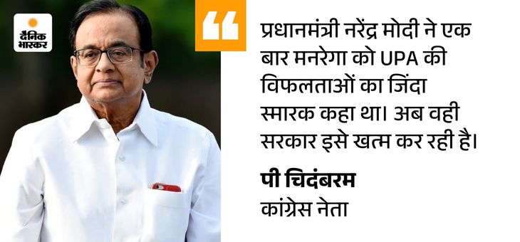 - चिदंबरम ने भी सरकार के उस दावे को खारिज कर दिया कि वे काम के दिनों को बढ़ाकर 125 कर देंगे। दरअसल राष्ट्रीय औसत वर्तमान में 50 दिन है, और केवल कुछ ही मजदूर निर्धारित 100 दिन पूरे कर पाते हैं।