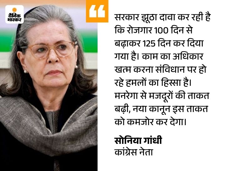 सोनिया गांधी ने 22 दिसंबर को अंग्रेजी अखबार The Hindu में पब्लिश अपने कॉलम ‘द बुलडोजर डिमॉलिश ऑफ मनरेगा’ में यह बात कही। उनका कॉलम तब आया है, जब राष्ट्रपति मुर्मू विकसित भारत ग्रामीण रोजगार आजीविका मिशन (ग्रामीण) (VB-G RAM G) बिल को मंजूरी दे चुकी हैं, जो मनरेगा की जगह लेगा।
