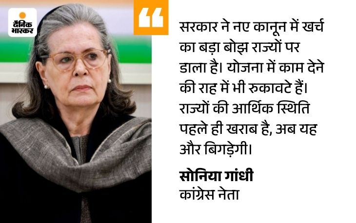 कांग्रेस संसदीय दल की अध्यक्ष सोनिया गांधी ने कहा है कि महात्मा गांधी राष्ट्रीय ग्रामीण रोजगार गारंटी अधिनियम यानी MGNREGA को खत्म करने से गांवों में रहने वाले करोड़ों लोगों पर बुरा असर पड़ेगा। मनरेगा खत्म होना सामूहिक नाकामी है। इसके खिलाफ सभी से एकजुट होना चाहिए।