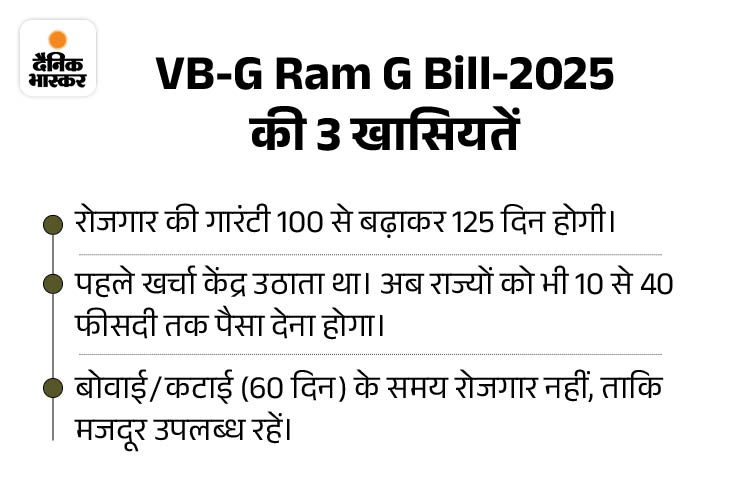इस नए कानून में ग्रामीण मजदूरों को 125 दिन काम देने की गारंटी दी गई है। संसद के शीतकालीन सत्र के दौरान 16 दिसंबर को लोकसभा से VB-G-RAM-G बिल पास किया गया था। 18 दिसंबर को इसे राज्यसभा से पास किया गया था।