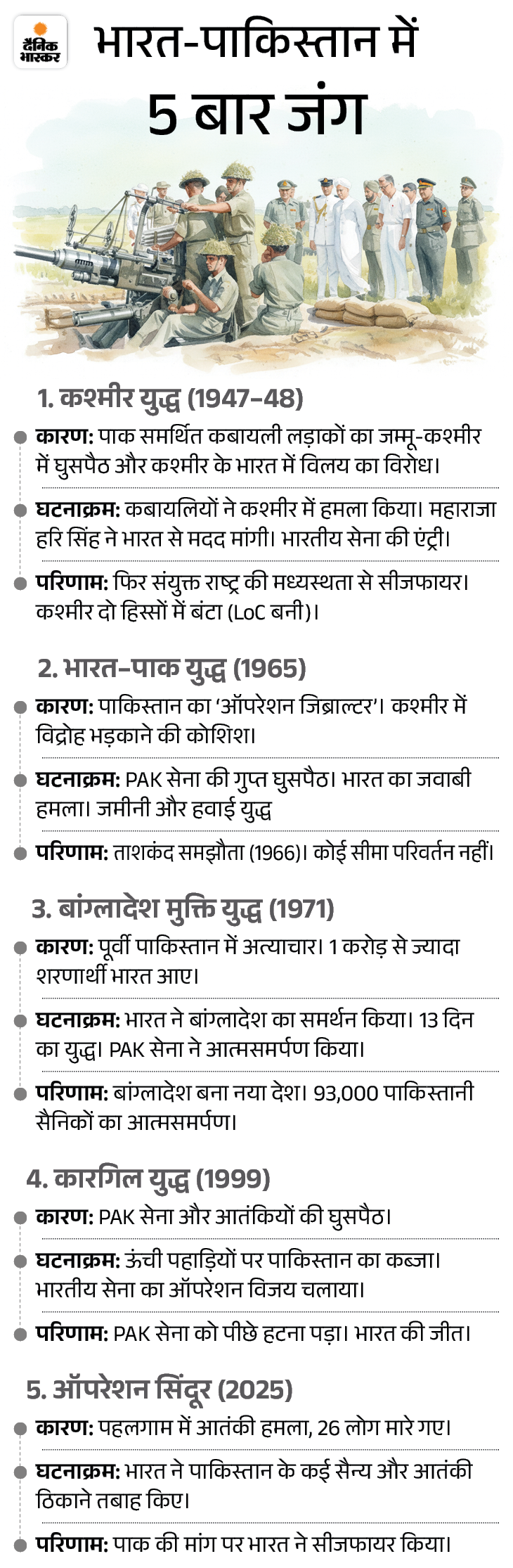 भारत और पाकिस्तान में अब तक 5 बार जंग हुई है। सभी में पाकिस्तान को हार का सामना करना पड़ा है।