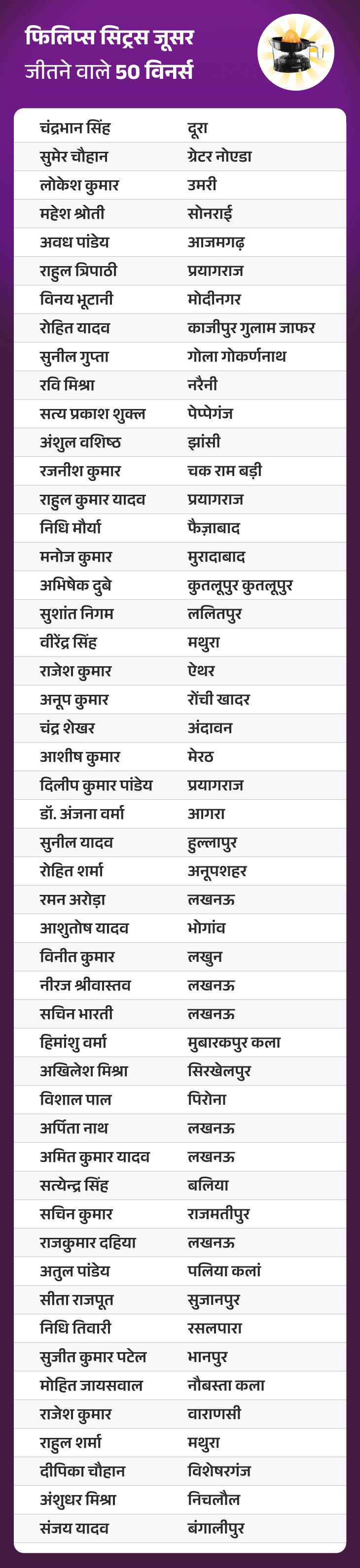दैनिक भास्कर एप के 30 दिसंबर, 2025 के ‘जीतो 1 करोड़ QUIZ’ में सभी सवालों के सही जवाब देकर “फिलिप्स सिट्रस जूसर” जीतने वाले 50 विनर्स की लिस्ट सामने आ गई है।
