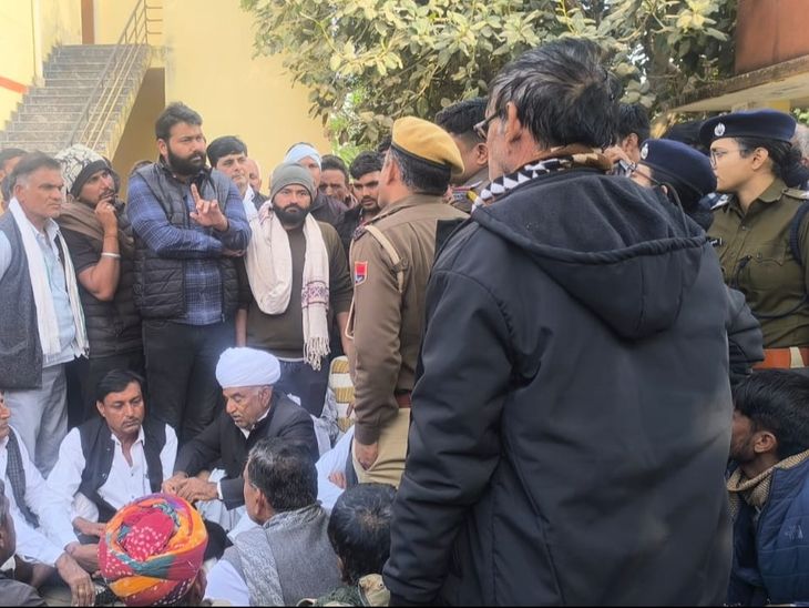 लाडनूं अस्पताल की मोर्च्युरी के बाहर धरने पर बेठे ग्रामीण और परिजन