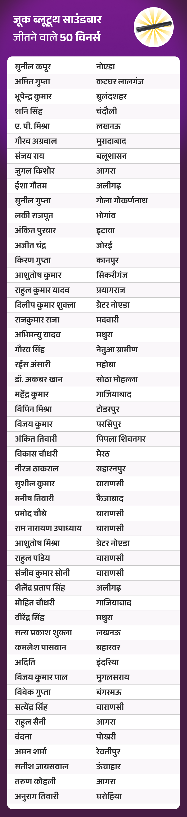 दैनिक भास्कर एप के 31 दिसंबर, 2025 के ‘जीतो 1 करोड़ QUIZ’ में सभी सवालों के सही जवाब देकर “जूक ब्लूटूथ साउंडबार” जीतने वाले 50 विनर्स की लिस्ट सामने आ गई है।