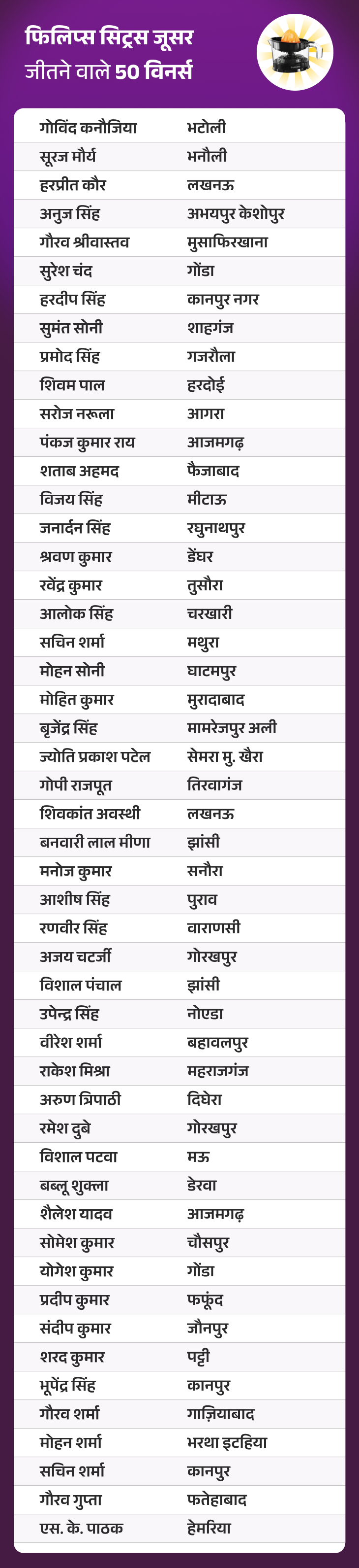 दैनिक भास्कर एप के 1 जनवरी, 2026 के ‘जीतो 1 करोड़ QUIZ’ में सभी सवालों के सही जवाब देकर “फिलिप्स सिट्रस जूसर” जीतने वाले 50 विनर्स की लिस्ट सामने आ गई है।