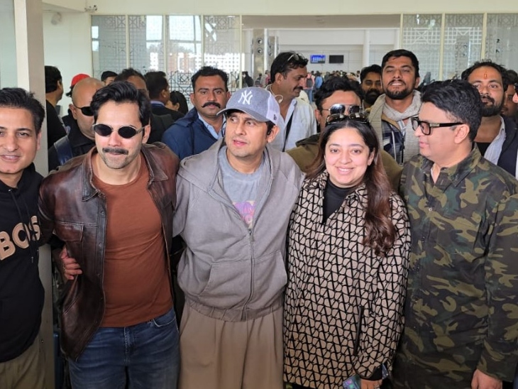 एयरपोर्ट पर कैमरे के सामने पोज देते हुए एक्टर वरुण धवन।