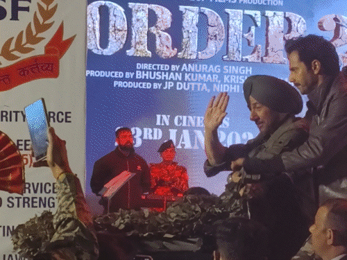 गाने के लॉन्च इवेंट में सनी देओल-वरुण धवन मंच से जवानों का अभिवादन करते हुए।