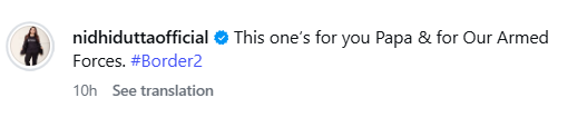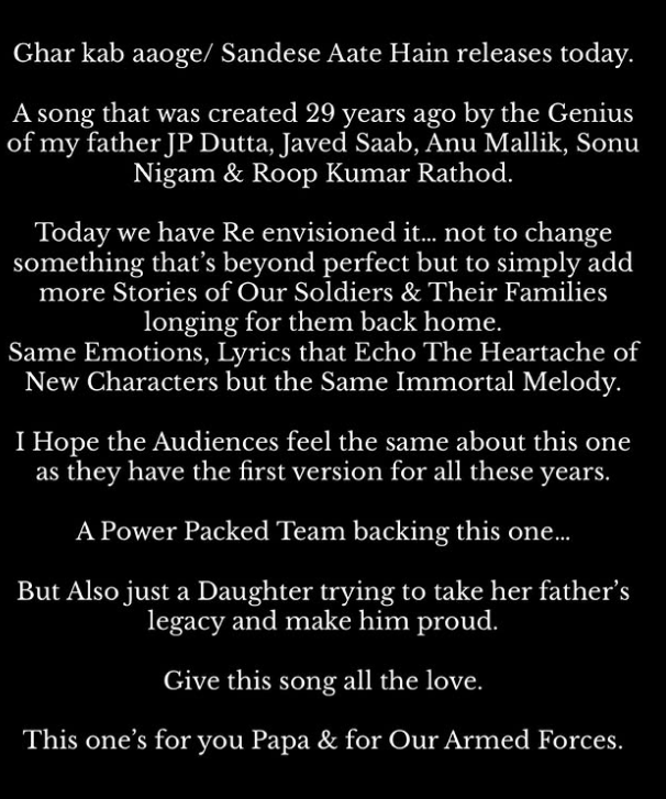गाने को लेकर निधि दत्ता ने लिखा था, “घर कब आओगे/संदेशे आते हैं आज रिलीज हो चुका है। यह गीत 29 साल पहले मेरे पिता जेपी दत्ता, जावेद साहब, अनु मलिक, सोनू निगम और रूप कुमार राठौड़ की प्रतिभा से रचा गया था।”