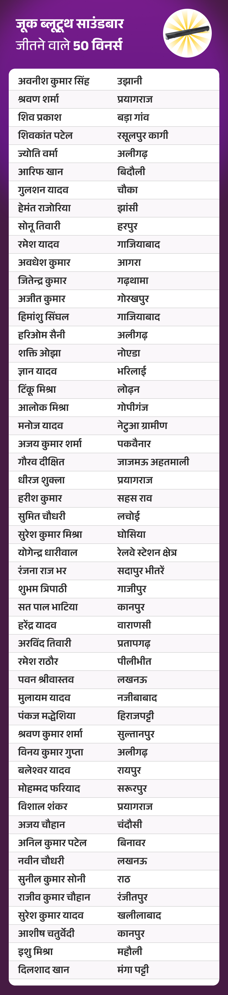 दैनिक भास्कर एप के 2 जनवरी, 2026 के ‘जीतो 1 करोड़ QUIZ’ में सभी सवालों के सही जवाब देकर “जूक ब्लूटूथ साउंडबार” जीतने वाले 50 विनर्स की लिस्ट सामने आ गई है।