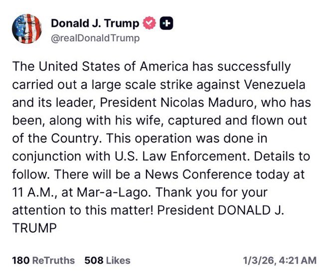 ट्रुथ सोशल पर एक पोस्ट में, ट्रम्प ने कहा कि ऑपरेशन के बाद मादुरो और उनकी पत्नी को पकड़ लिया गया और देश से बाहर भेज दिया गया।