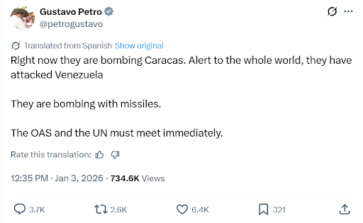 वेनेजुएला के पड़ोसी देश कोलंबिया के राष्ट्रपति गुस्तावो पेट्रो ने सोशल मीडिया पोस्ट में कहा कि “इस समय काराकस पर बमबारी हो रही है। पूरी दुनिया को अलर्ट किया जाता है।” उन्होंने UN से मामले की जांच करने को कहा।