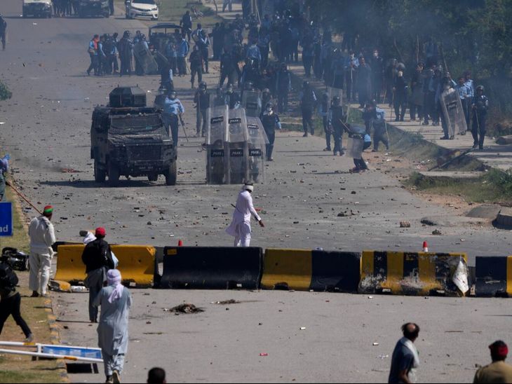 पाकिस्तान के पूर्व प्रधानमंत्री इमरान खान के समर्थकों ने पुलिस पर 9 मई, 2023 को पत्थर फेंके।