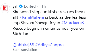 YRF ने इंस्टाग्राम पर फिल्म की रिलीज डेट की घोषणा करते हुए इसका पोस्टर भी शेयर किया। साथ में लिखा, “वह तब तक नहीं रुकेगी, जब तक वह उन सभी को बचा नहीं लेती। रानी मुखर्जी मर्दानी 3 में निडर कॉप शिवानी शिवाजी रॉय के रूप में वापस आ गई हैं। रेस्क्यू 30 जनवरी को आपके नजदीकी सिनेमाघरों में शुरू होगी।”