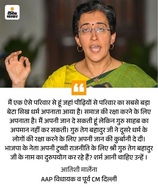CM मान कहा-भाजपा पंजाब विरोधी है CM भगवंत मान ने आतिशी का बचाव करते हुए भाजपा पर सिख विरोधी और पंजाब विरोधी होने का आरोप लगाया। उन्होंने एक्स पर लिखा-भाजपा ने वीडियो में छेड़छाड़ की है और जानबूझकर गुरु तेग बहादुर जी का नाम जोड़ा है, जो आतिशी ने कभी बोला ही नहीं। उन्होंने इसके लिए भाजपा से सिख समुदाय और पंजाब के लोगों से माफी मांगने को कहा।