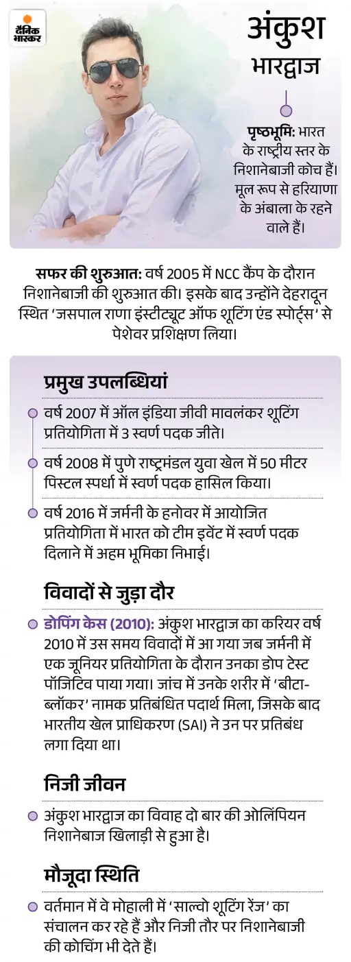गोल्ड मैडलिस्ट रह चुका है कोच आरोपी कोच अंकुश भारद्वाज को इंडिया की तरफ से नेशनल कोच बनाया हुआ था। इस घटना के बाद नेशनल राइफल एसोसिएशन ऑफ इंडिया ने आरोपी कोच अंकुश भारद्वाज को सस्पेंड कर दिया। एसोसिएशन का कहना है कि जब तक जांच पूरी नहीं होगी, अंकुश सस्पेंड रहेगा। अंकुश भारद्वाज कॉमनवेल्थ यूथ गेम्स-2008 और हेनोवर में 2016 में इंटरनेशनल शूटिंग चैंपियनशिप में स्वर्ण पदक जीत चुका है। इसके अलावा उसके पास कई बड़ी उपलब्धियां रही हैं।