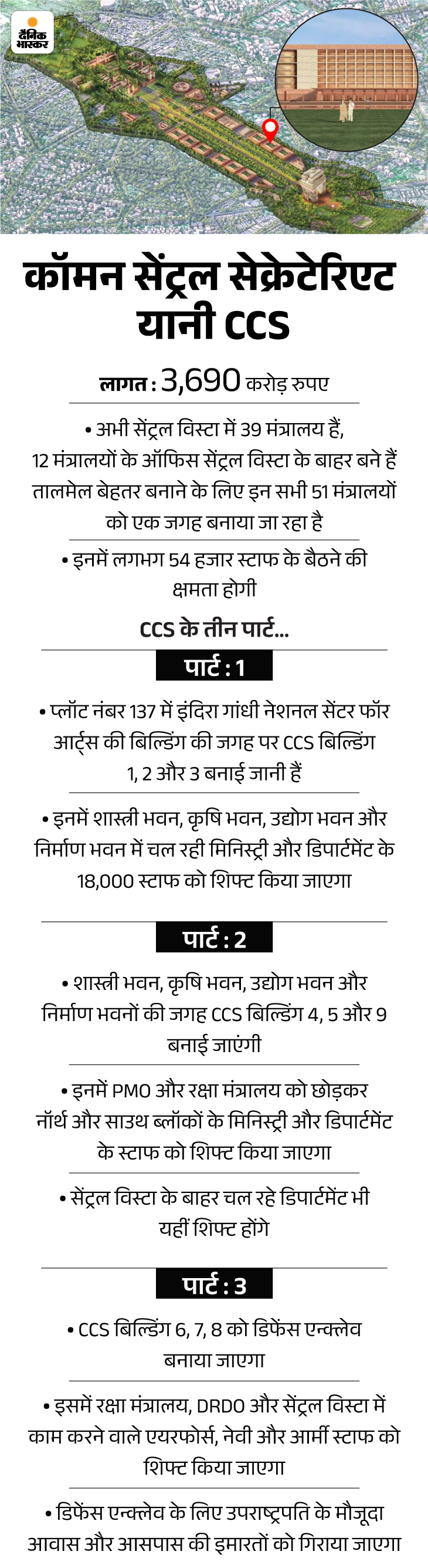 सेंट्रल विस्टा री डेवलपमेंट प्रोजेक्ट के तहत सभी मंत्रालयों के लिए कर्तव्य पथ पर 10 ऑफिस बिल्डिंग और एक कन्वेंशन सेंटर समेत CCS बनना है। इनमें से तीन बिल्डिंग लगभग बन चुकी हैं। सभी ऑफिस शिफ्ट होने के बाद दोनों ब्लॉकों को ‘युगे युगीन भारत राष्ट्रीय संग्रहालय’में बदल दिया जाएगा।