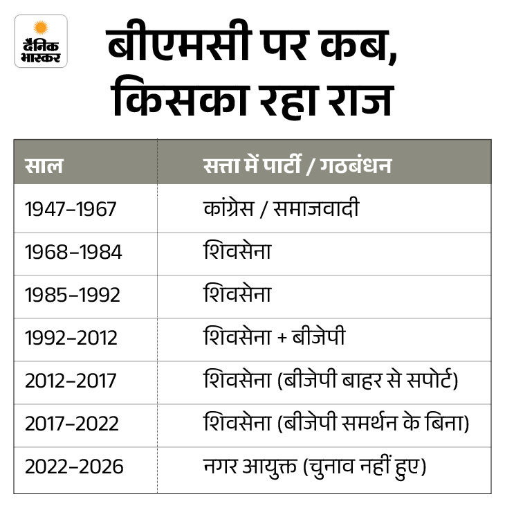 आजादी के बाद 77 सालों से मुंबई नगर निगम पर कांग्रेस और शिवसेना का ही कब्जा रहा है। 1947 से 1967 तक यानी 20 साल तक कांग्रेस का मेयर रहा। वहीं 1992 से लेकर 2022 यानी 30 सालों तक मेयर की कुर्सी पर शिवसेना काबिज रही।