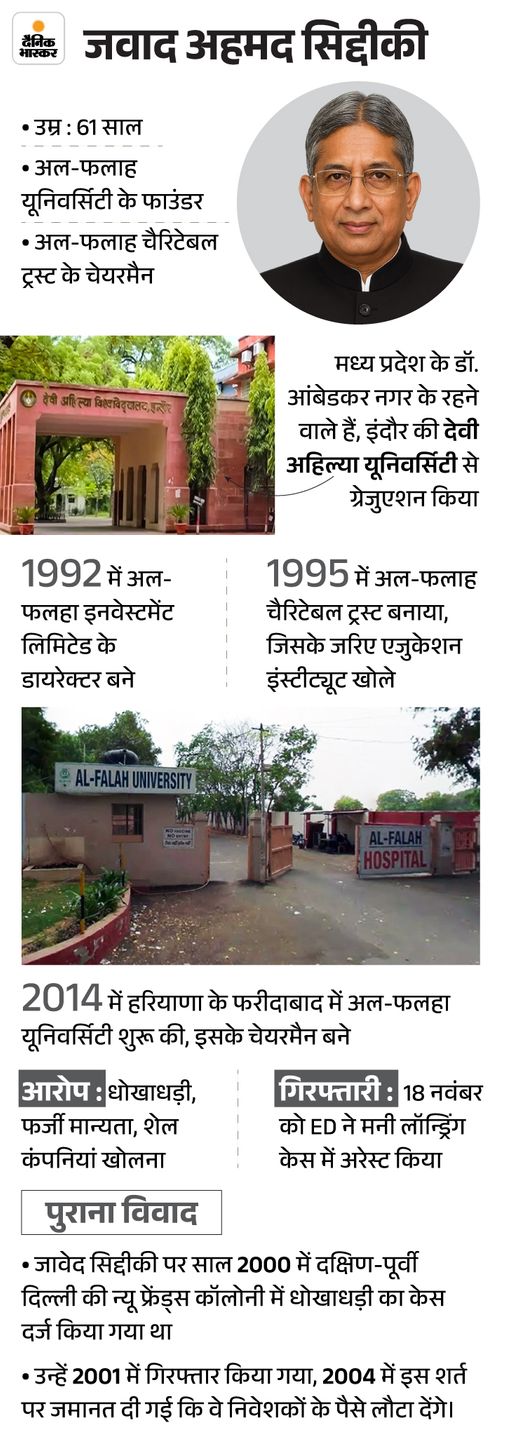 18 नवंबर को ED ने दिल्ली में अल-फलाह ग्रुप के ऑफिस पर रेड की थी। 12 घंटे चले सर्च के बाद चेयरमैन जवाद अहमद सिद्दीकी को गिरफ्तार किया गया था।