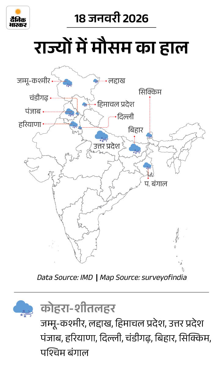हिमाचल प्रदेश में ताबो का तापमान राज्य में सबसे कम -2.6°C रहा। उत्तराखंड के चमोली और पिथौरागढ़ के ऊंचे इलाकों में शनिवार को बर्फबारी हुई। बिहार के 18 जिलों में कोहरे को लेकर यलो अलर्ट जारी किया गया है।