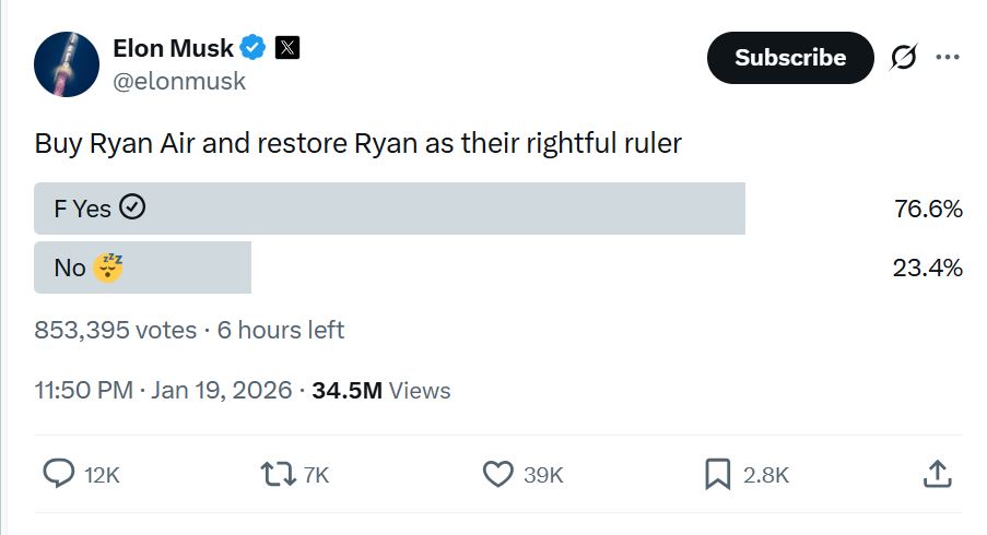 - Elon Musk Polls Followers On Buying Ryanair, Ryanair CEO OLeary Called Idiot