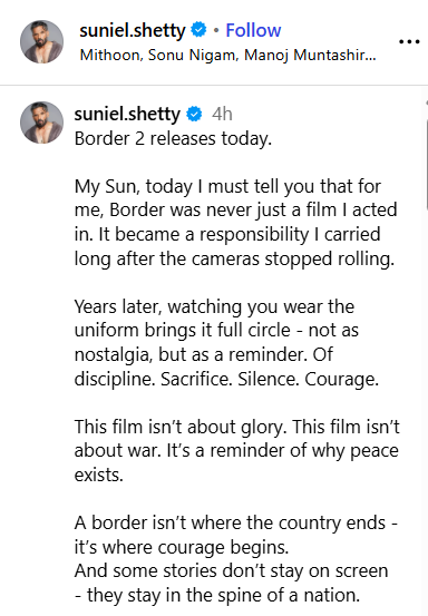 एक्टर ने लिखा- ‘आज बॉर्डर 2 आज रिलीज हो रही है। मेरे बेटे, आज मैं तुम्हें बताना चाहता हूं कि मेरे लिए बॉर्डर एक फिल्म नहीं थी, जिसमें मैंने काम किया। ये एक जिम्मेदारी बन गई थी, जो मैंने शूटिंग खत्म होने के बाद तक निभाया। सालों बाद, तुम्हें वर्दी पहने देखना एक तरह से पुरानी यादों को ताजा कर देता है। यह पुरानी यादों की नहीं, बल्कि अनुशासन, बलिदान, मौन और साहस की याद दिलाता है।