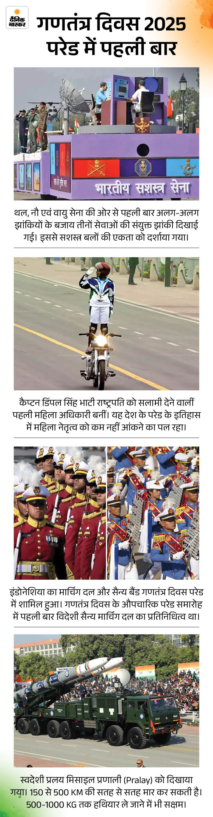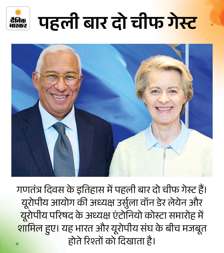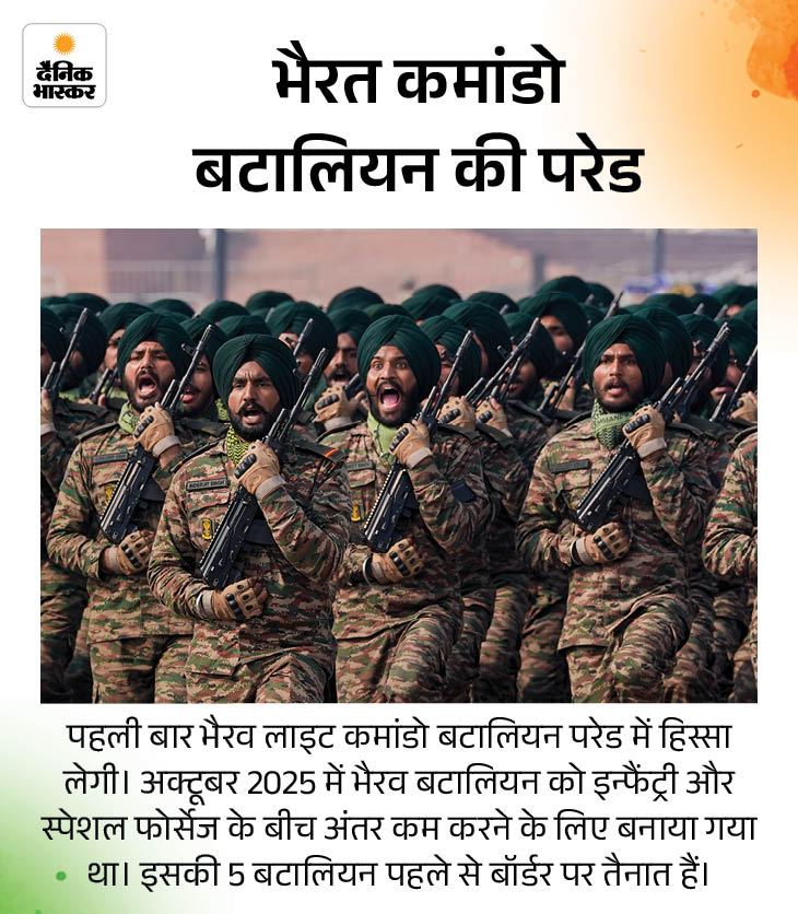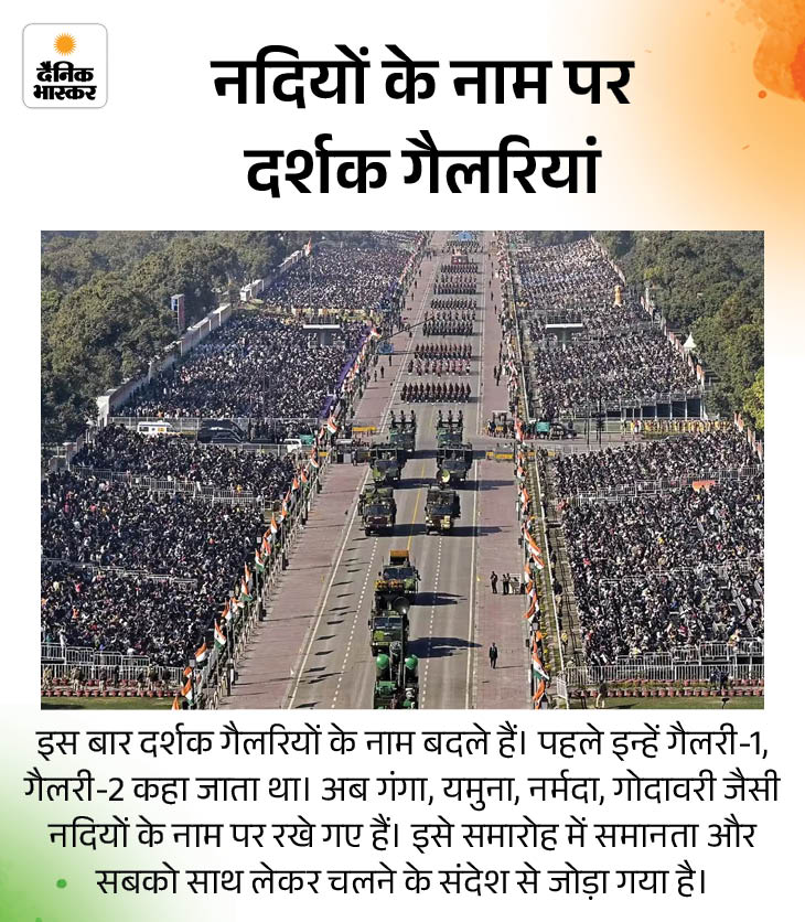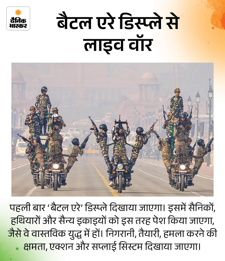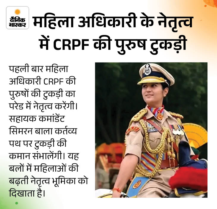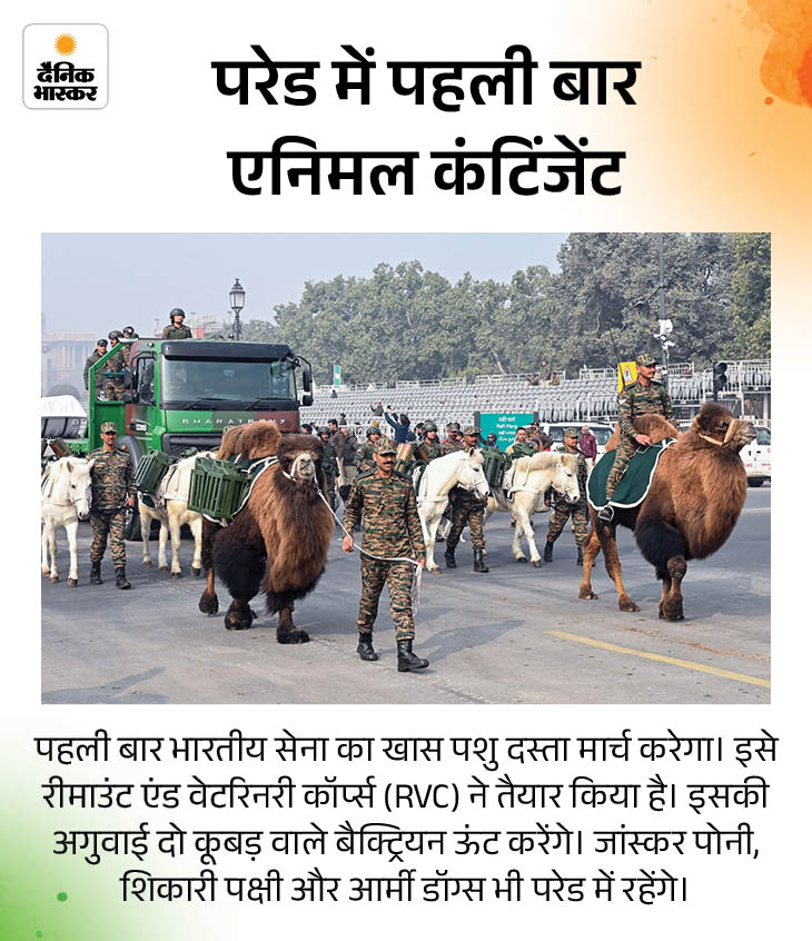 भारत 26 जनवरी को 77वां गणतंत्र दिवस मनाएगा। राजधानी दिल्ली में कर्तव्य पथ पर गणतंत्र दिवस परेड में इस बार कई बदलाव नजर आएंगे। इनमें कुछ इतिहास में पहली बार हैं। पहली बार दो चीफ गेस्ट हैं। CRPF की पुरुष रेजिमेंट का नेतृत्व महिला अधिकारी करेंगी। सेना के युद्ध का लाइव डिस्प्ले और पशुओं की परेड भी है।