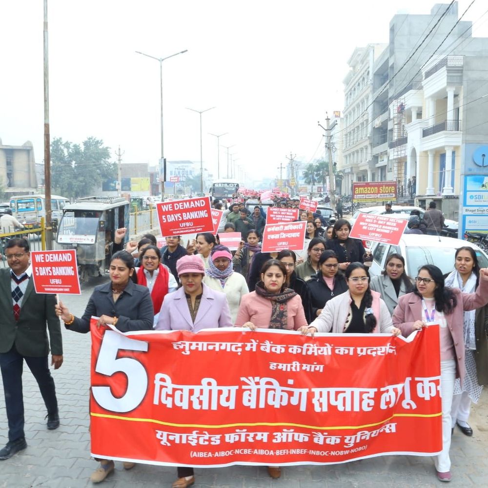यूनाइटेड फोरम ऑफ बैंक यूनियंस (यूएफबीयू) के आह्वान पर मंगलवार को जिलेभर में बैंक कर्मचारियों की देशव्यापी हड़ताल का व्यापक असर दिखा। हनुमानगढ़ जिले की सभी राष्ट्रीयकृत बैंकों की शाखाएं बंद रहीं, जिससे बैंकिंग कामकाज पूरी तरह ठप हो गया और करोड़ों रुपए का लेन-देन प्रभावित हुआ। बैंक बंद रहने से आम खाताधारकों, व्यापारियों, किसानों और पेंशनधारकों को भारी परेशानियों का सामना करना पड़ा। नकद लेन-देन से लेकर चेक क्लियरेंस तक हर तरह की बैंकिंग सेवाएं बाधित रहीं। हड़ताल का मुख्य मुद्दा बैंक कर्मचारियों की लंबे समय से लंबित पांच दिवसीय कार्य सप्ताह (फाइव-डे वीक) की मांग रहा है। कर्मचारियों का कहना है कि बढ़ते कार्यभार, मानसिक दबाव और लंबी ड्यूटी के चलते बैंकों में भी अन्य सरकारी विभागों की तरह सप्ताह में पांच दिन कार्य प्रणाली लागू की जानी चाहिए। इसके साथ ही कर्मचारी विरोधी नीतियों के खिलाफ भी रोष जताया गया। जंक्शन में टाउन रोड स्थित पंजाब नेशनल बैंक (पीएनबी) मंडल कार्यालय के मुख्य गेट पर जिलेभर के बैंक कर्मचारी एकत्रित हुए और जोरदार विरोध-प्रदर्शन किया। कर्मचारियों ने केंद्र सरकार और वित्त मंत्रालय के खिलाफ नारेबाजी करते हुए तख्तियों के जरिए अपनी मांगें उठाईं। इसके बाद यूएफबीयू के नेतृत्व में एक रैली निकाली गई। यह रैली पीएनबी मंडल कार्यालय से शुरू होकर बस स्टैंड, शहीद भगत सिंह चौक और रेलवे स्टेशन होते हुए वापस मंडल कार्यालय पहुंचकर संपन्न हुई। प्रदर्शन में शामिल यूनियन नेताओं ने चेतावनी दी कि यदि मांगों पर जल्द सकारात्मक निर्णय नहीं लिया गया तो आंदोलन और तेज किया जाएगा। उन्होंने सरकार से बातचीत के जरिए समाधान निकालने की अपील भी की। इस प्रदर्शन में पीएनबीईयू राजस्थान के डिप्टी जनरल सेक्रेटरी एवं आरपीबीईयू के रीजनल सेक्रेटरी प्रदीप गोयल, एसबीआईएसए के रीजनल सेक्रेटरी जगप्रीत धींगड़ा, एनसीबीई के रीजनल सेक्रेटरी डूंगरराम भाटी, मनीष सेवटा, प्रदीप जोशी, अंकित डोडा, गौरव चिलाना, करणवीर बराड़, संदीप भाखर, अधिकारी यूनियन से नवीन धायल और अभिषेक शाह सहित कई अन्य पदाधिकारी शामिल रहे।
