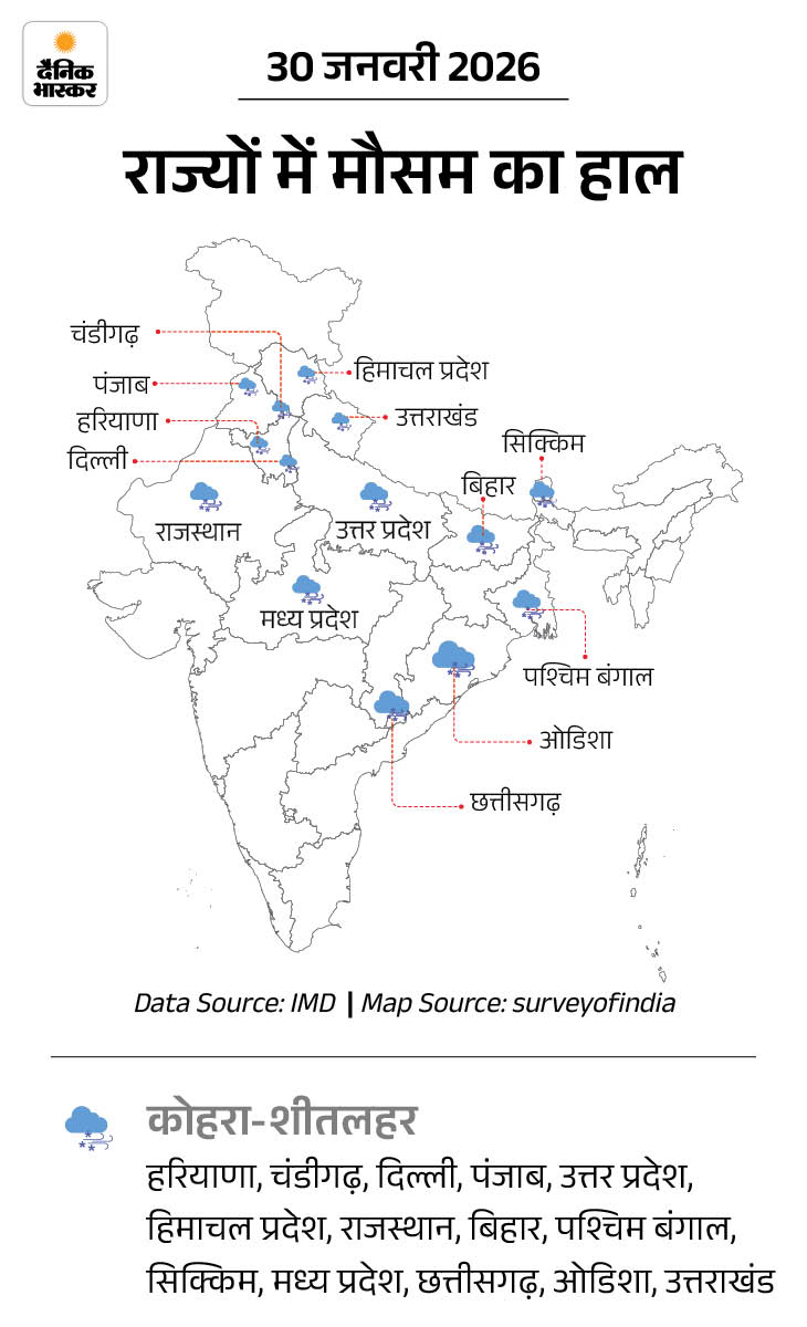 - दिल्ली- दिल्ली में ठंडा मौसम बना हुआ है। अधिकतम तापमान 17.9°C दर्ज किया गया, जो सामान्य से काफी कम है। 31 जनवरी से 2 फरवरी के बीच बारिश और आंधी-तूफान की संभावना है। हवा की गुणवत्ता खराब बनी हुई है और कई इलाकों में कोहरा भी छा सकता है।