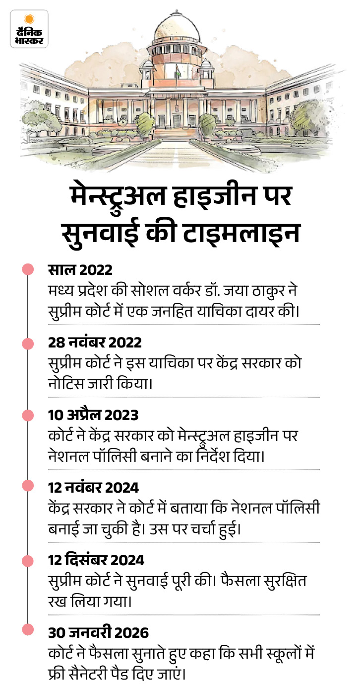 सोशल वर्कर जया ठाकुर ने 2022 में सुप्रीम कोर्ट में जनहित याचिका दायर करके लड़कियों के स्वास्थ्य सुरक्षा पर चिंता जताई थी। याचिका में बताया था कि पीरियड में होने वाली दिक्कतों के कारण कई लड़कियां स्कूल छोड़ देती हैं, क्योंकि उनके परिवार के पास पैड पर खर्च करने के लिए पैसे नहीं होते। उन दिनों (मासिक धर्म के दिनों में) कपड़ा यूज करके स्कूल जाना परेशानी का कारण बनता है।