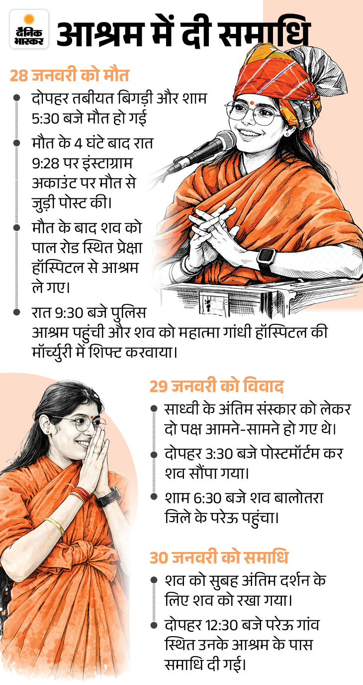 दरअसल, कथावाचक साध्वी प्रेम बाईसा की बुधवार(28 जनवरी) को संदिग्ध परिस्थितियों में मौत हो गई थी। शुक्रवार(30 जनवरी) को बालोतरा के परेऊ गांव में आश्रम में संत परंपरा के अनुसार समाधि दी गई।
