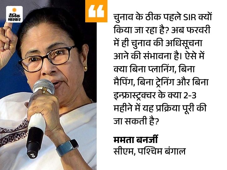 ममता ने कोर्ट में कहा था कि चुनाव से पहले 2 महीने में ऐसा कुछ करने की कोशिश की जा रही है, जो 2 साल में होना था। खेतीबाड़ी के मौसम में लोगों को परेशान किया जा रहा है। 24 साल बाद इसे 3 महीने में पूरा करने की जल्दबाजी क्यों है। 100 से ज्यादा लोगों की जान चली गई है। ECI की प्रताड़ना के चलते BLO की जान जा रही है।